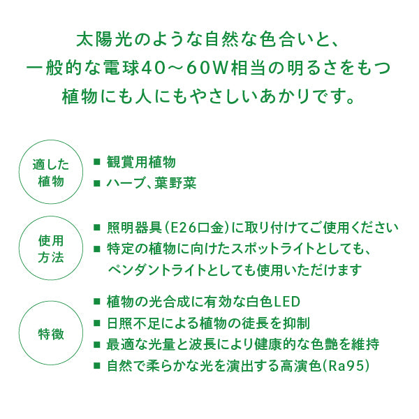 植物にも人にもやさしいあかりです。自然光に近いナチュラル色と暖かみのあるオレンジ色の2色展開。