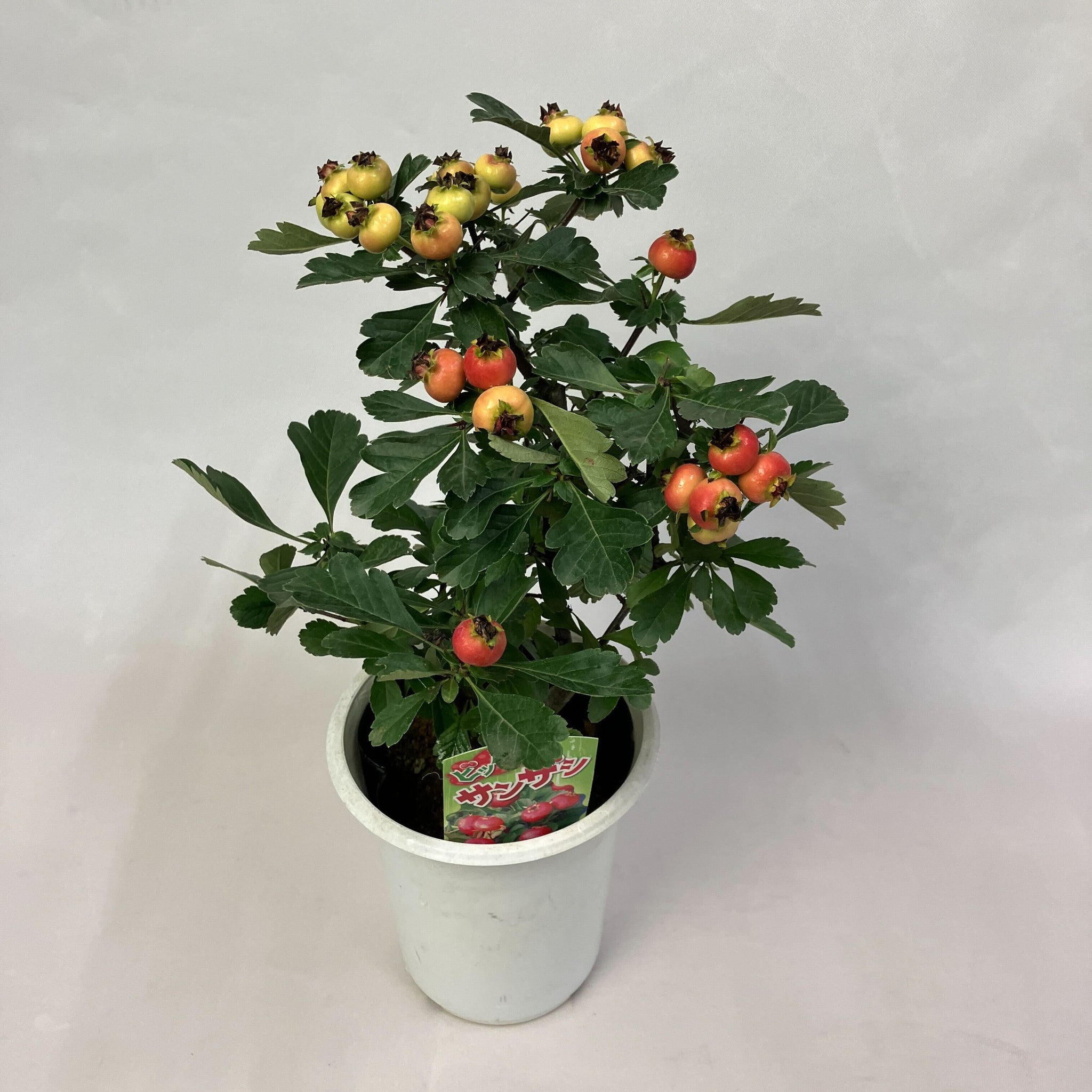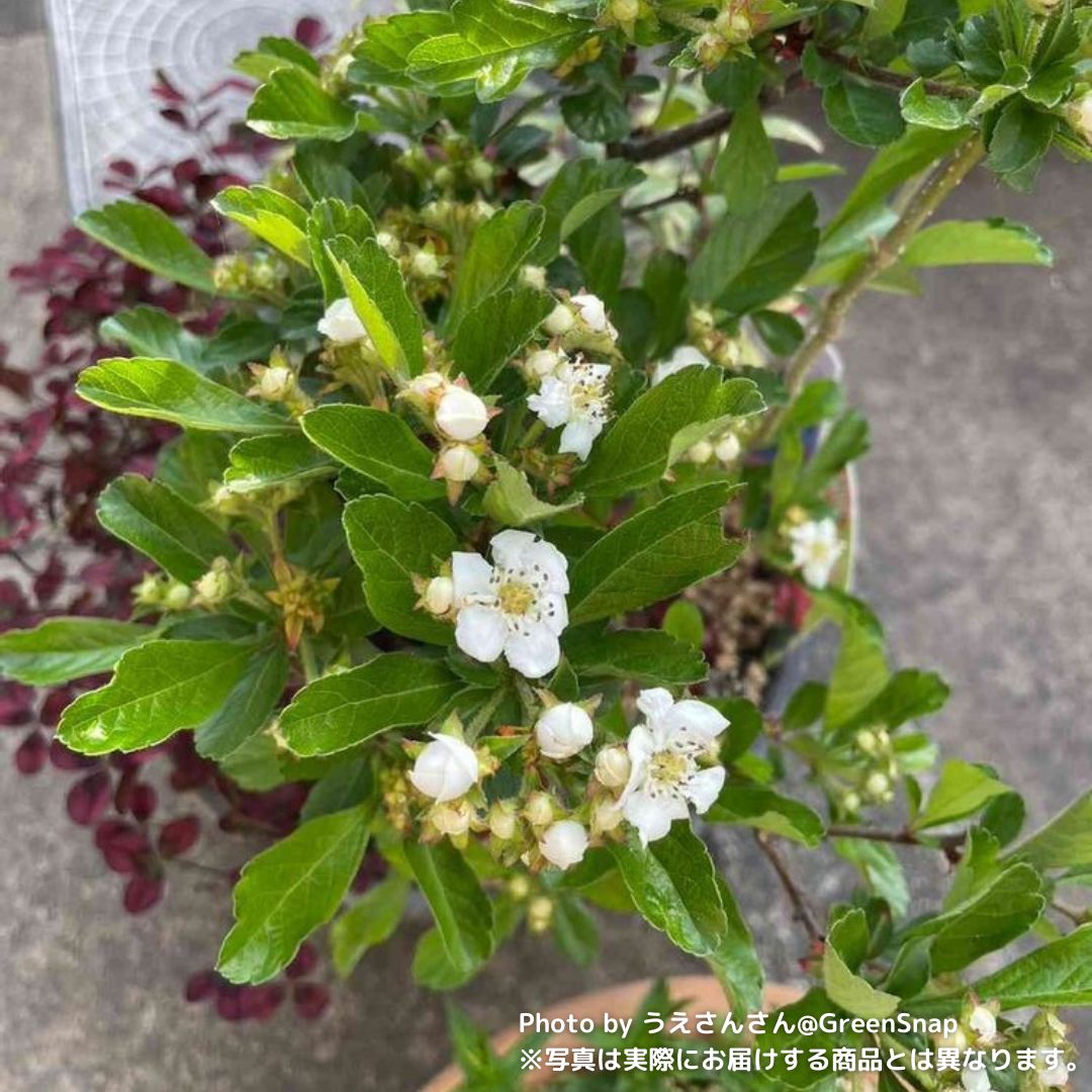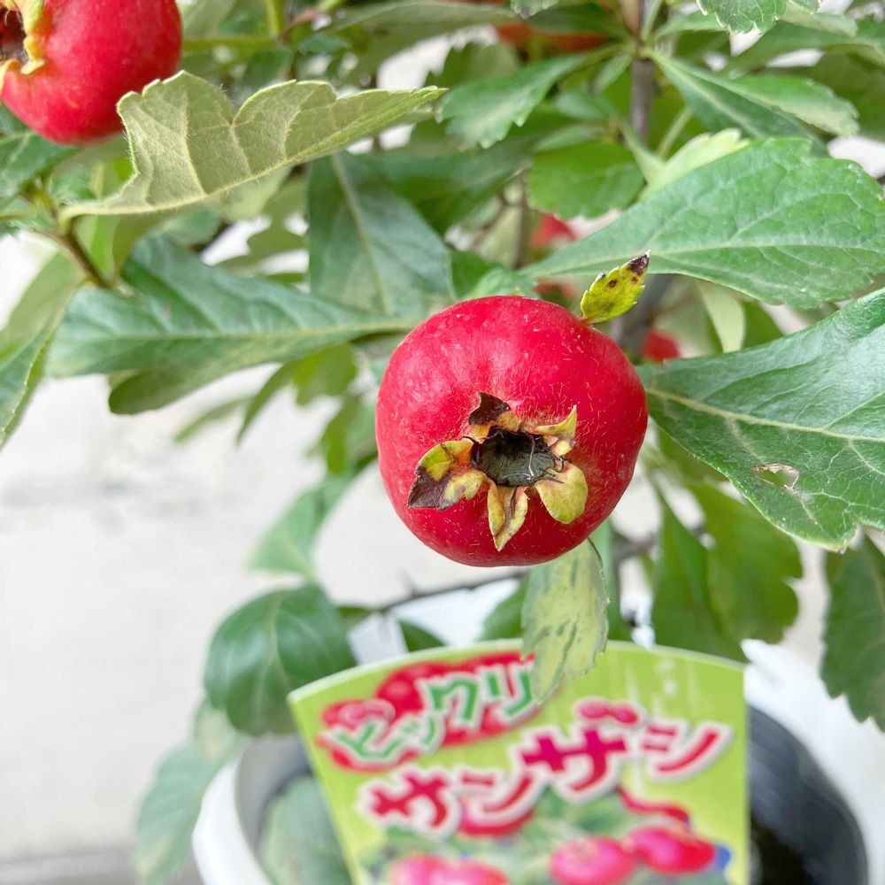 春になると白い小花を咲かせ、秋には大きく鮮やかな赤い実を枝いっぱいに実らせる「オオミサンザシ(ビックリサンザシ)」。5号鉢サイズはベランダや玄関先、リビングでも気軽に楽しめます。