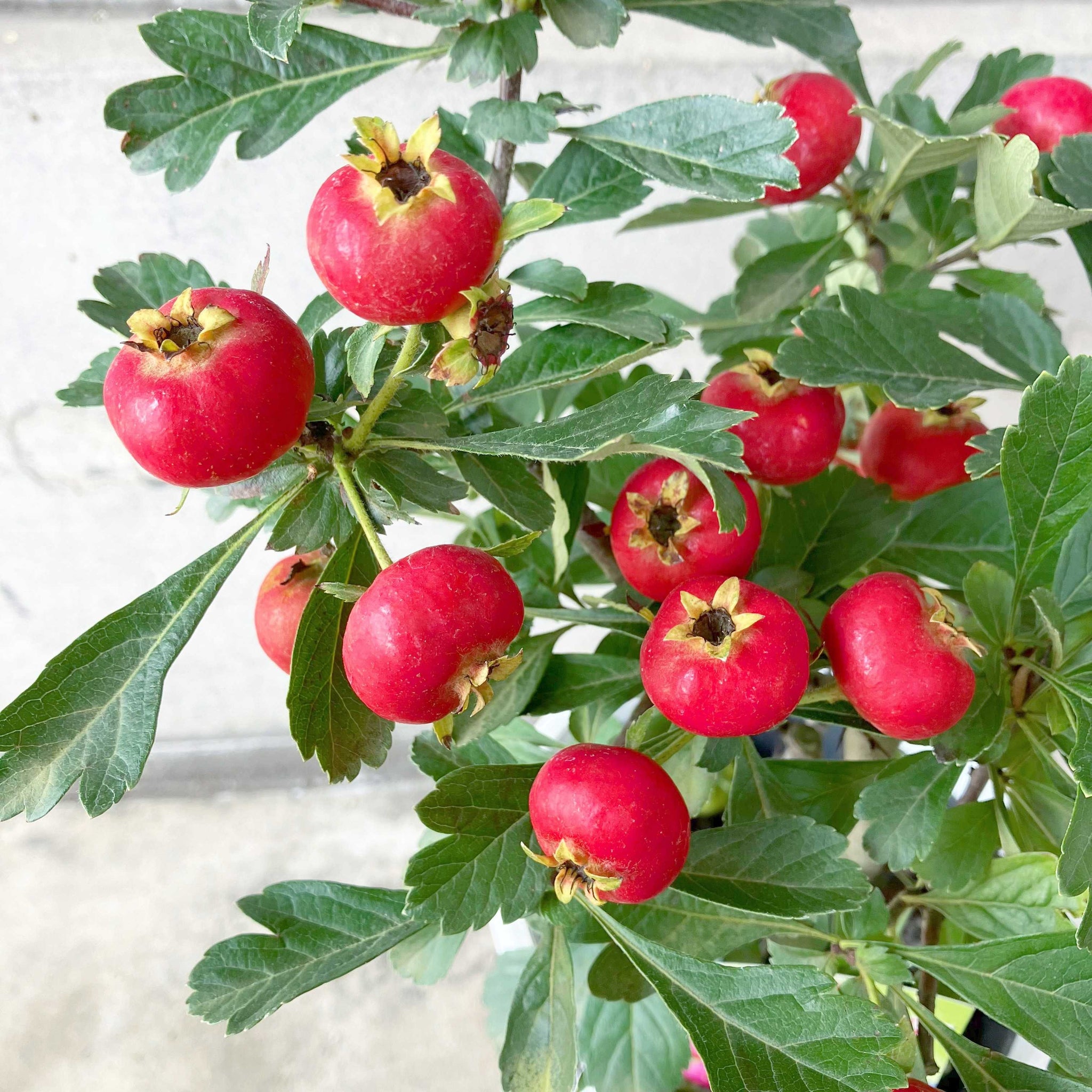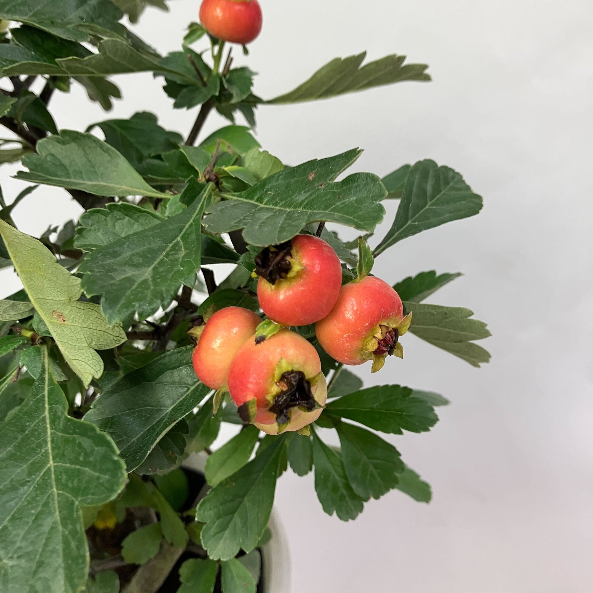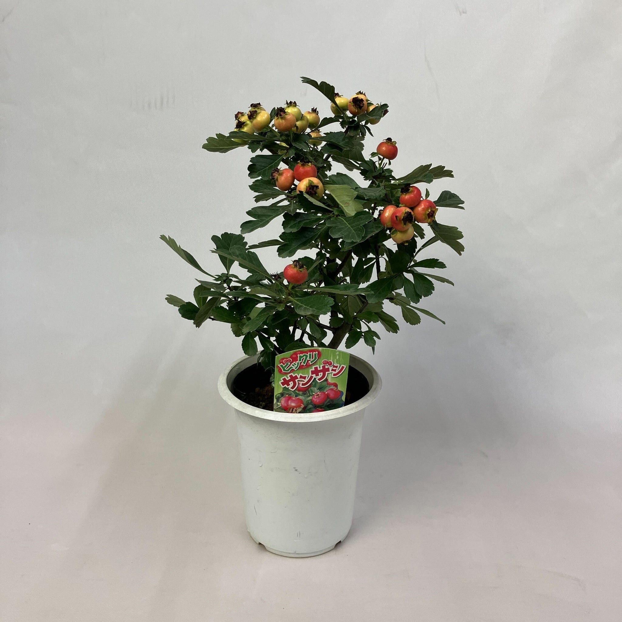 春になると白い小花を咲かせ、秋には大きく鮮やかな赤い実を枝いっぱいに実らせる「オオミサンザシ(ビックリサンザシ)」。5号鉢サイズはベランダや玄関先、リビングでも気軽に楽しめます。