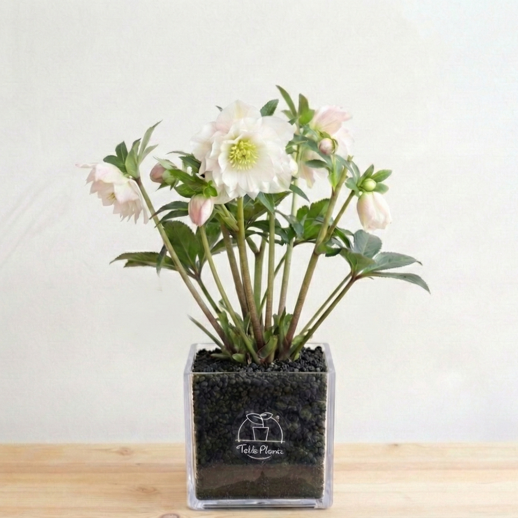 「冬の貴婦人」と呼ばれるクリスマスローズ。希少な八重咲きのお花が、お部屋に上品な華やぎを添えます。 ボタニカルソイルを使った新しいテーブルプランツは室内でも安心して育てていただけます。。水やりも一目で分かり、植物初心者の方でも長く楽しめます。 洗練されたインテリアとしてはもちろん、大切な方への冬のギフトにも。心安らぐひとときを、この一鉢と共に。